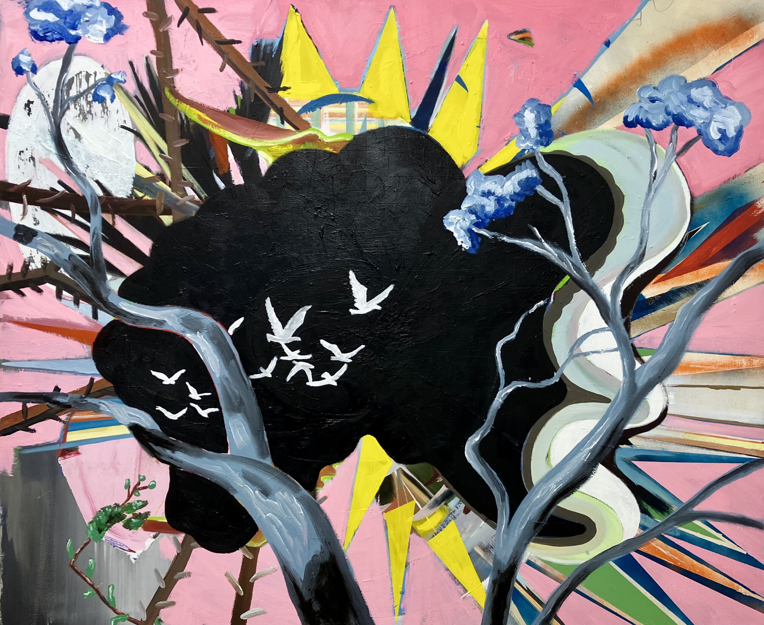 Öl, Acryl und Lack auf Hartfaserplatte. 60 x 45 x 0.5 cm, aus der Serie „Von Menschen und Vögel, unter anderem.“ 2024
